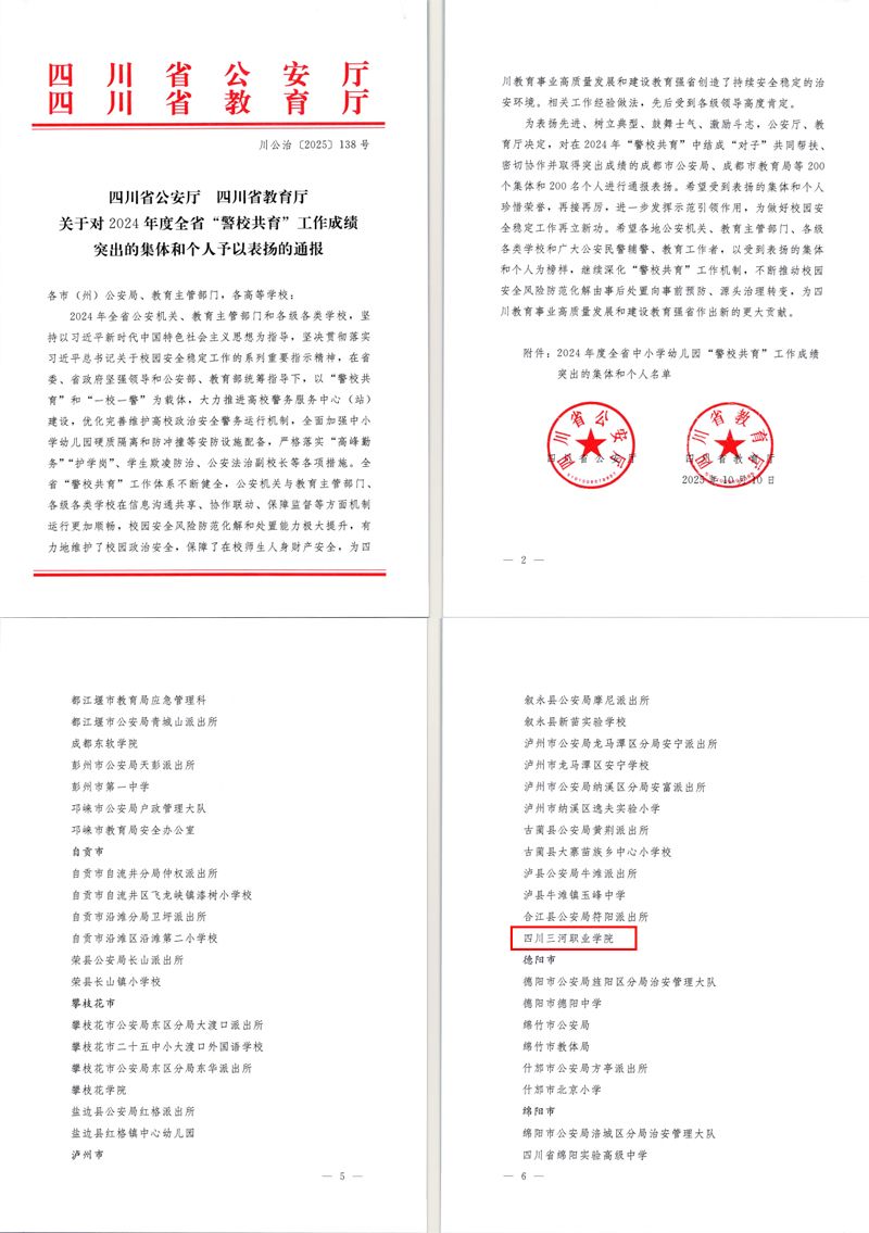 近日,四川省公安廳、教育廳聯合發布《關于對2024年度全省“警校共育”工作成績突出的集體和個人予以表揚的通報》,四川三河職業學院憑借在校園安全治理領域的創新實踐與顯著成效榜上有名,榮獲2024年度四川省“警校共育”先進集體稱號。